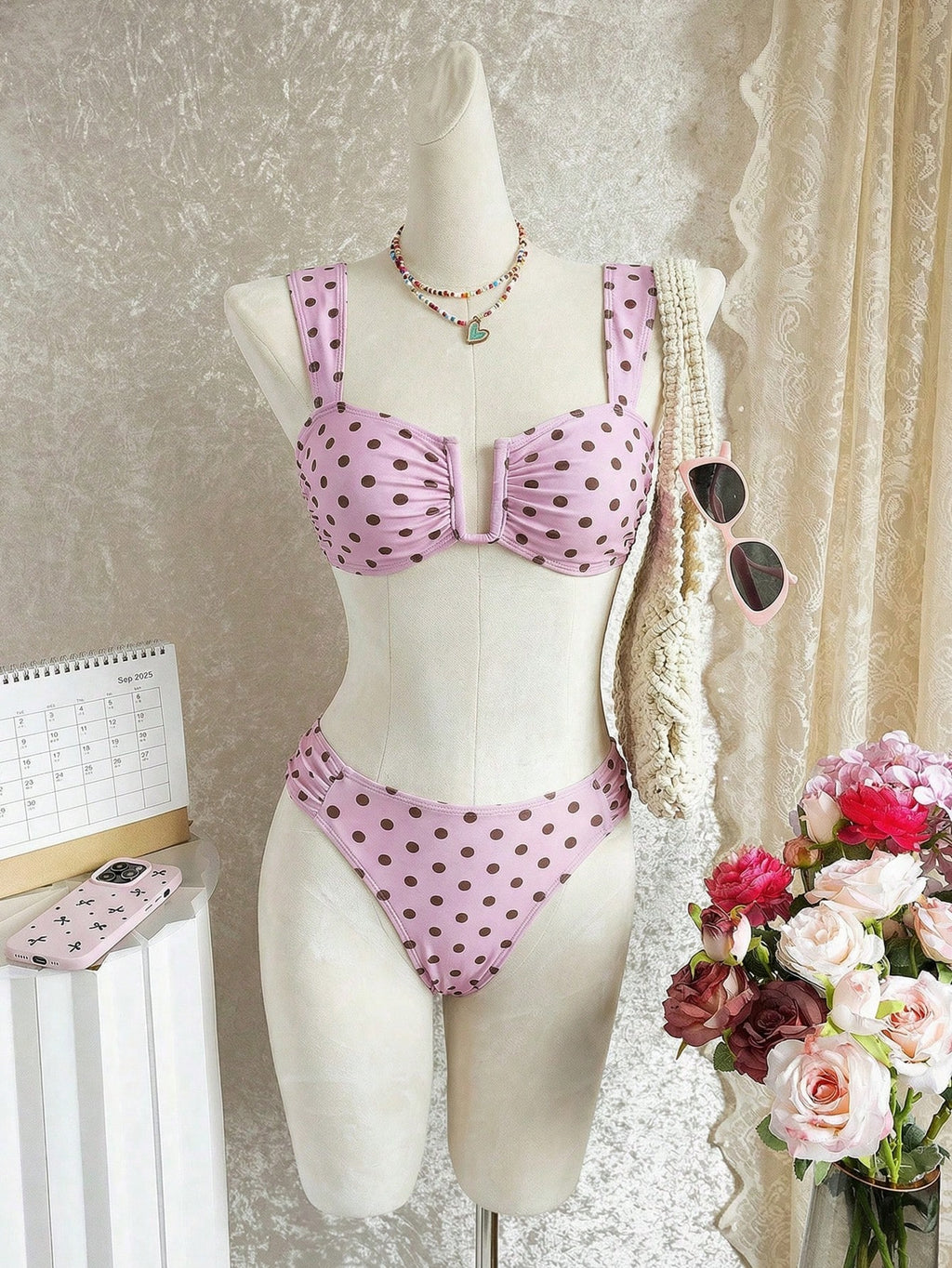 ✨ Biquíni com Alças Largas e Decote em U com Estampa de Poá – Verão ✨