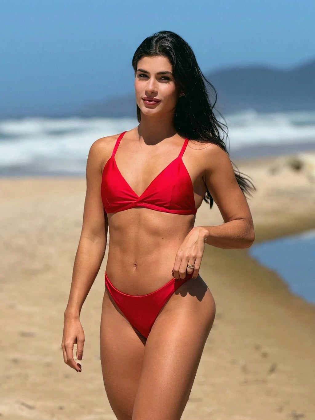 Com modelagem asa delta, o biquíni alonga a silhueta e valoriza as curvas, criando um visual poderoso e elegante. O acabamento brilhante traz um toque glamouroso que se destaca na praia, piscina ou beach club.
